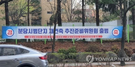 (성남=연합뉴스) 이우성 기자 = 5일 경기도 성남시 분당구 시범단지 내 한 도로에 재건축추진준비위원회 출범을 알리는 플래카드가 걸려 있다. 2022.4.11 gaonnuri@yna.co.kr